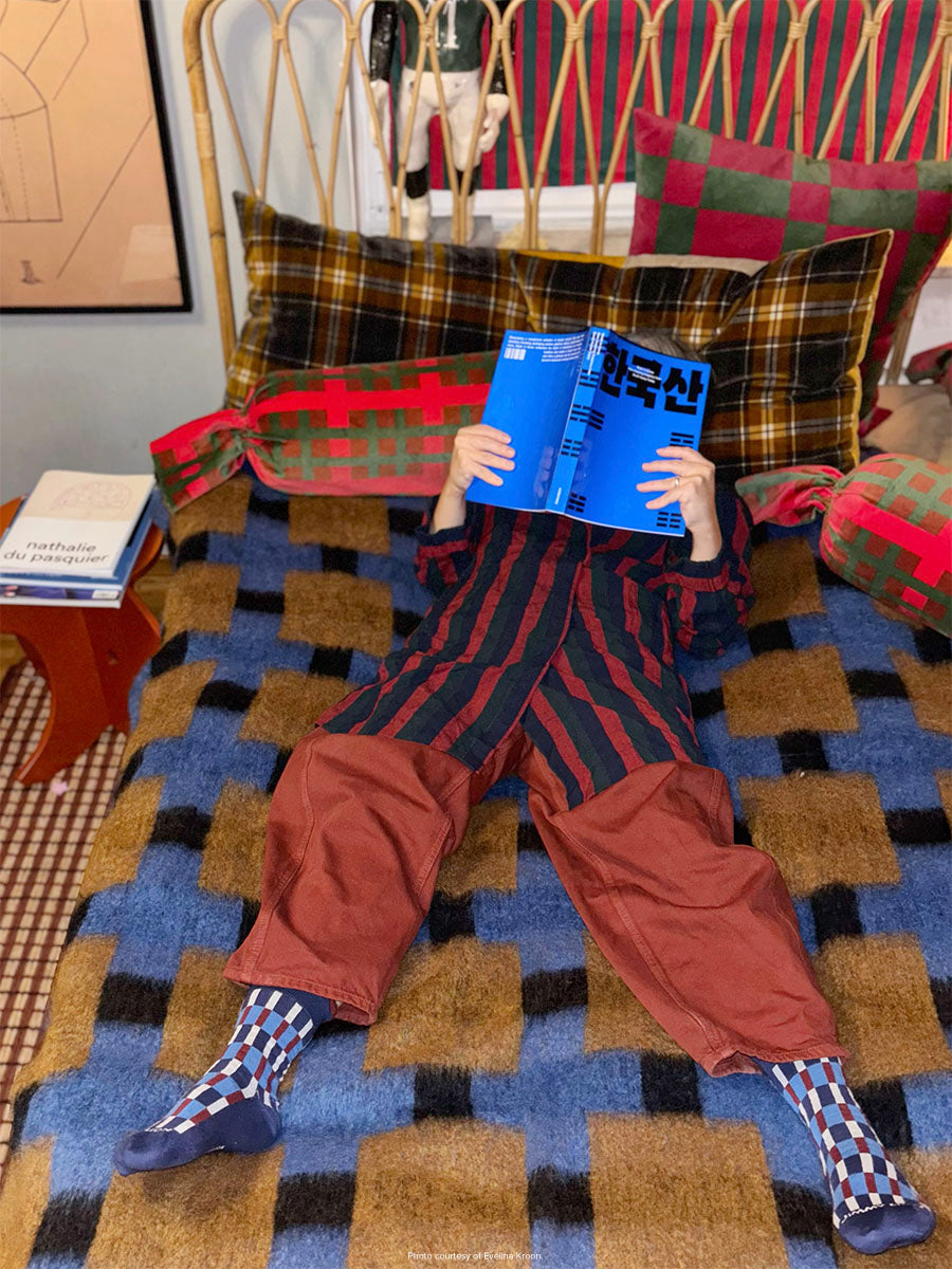 El diseño Evelina Kroon Blue Pattern reúne los colores que más uso: azul, burdeos y blanco roto. Es una combinación que, quizá, define mejor mi estética. Pero, al final, todo cobra sentido en conjunto: es cuando las piezas se ven juntas cuando realmente brillan.