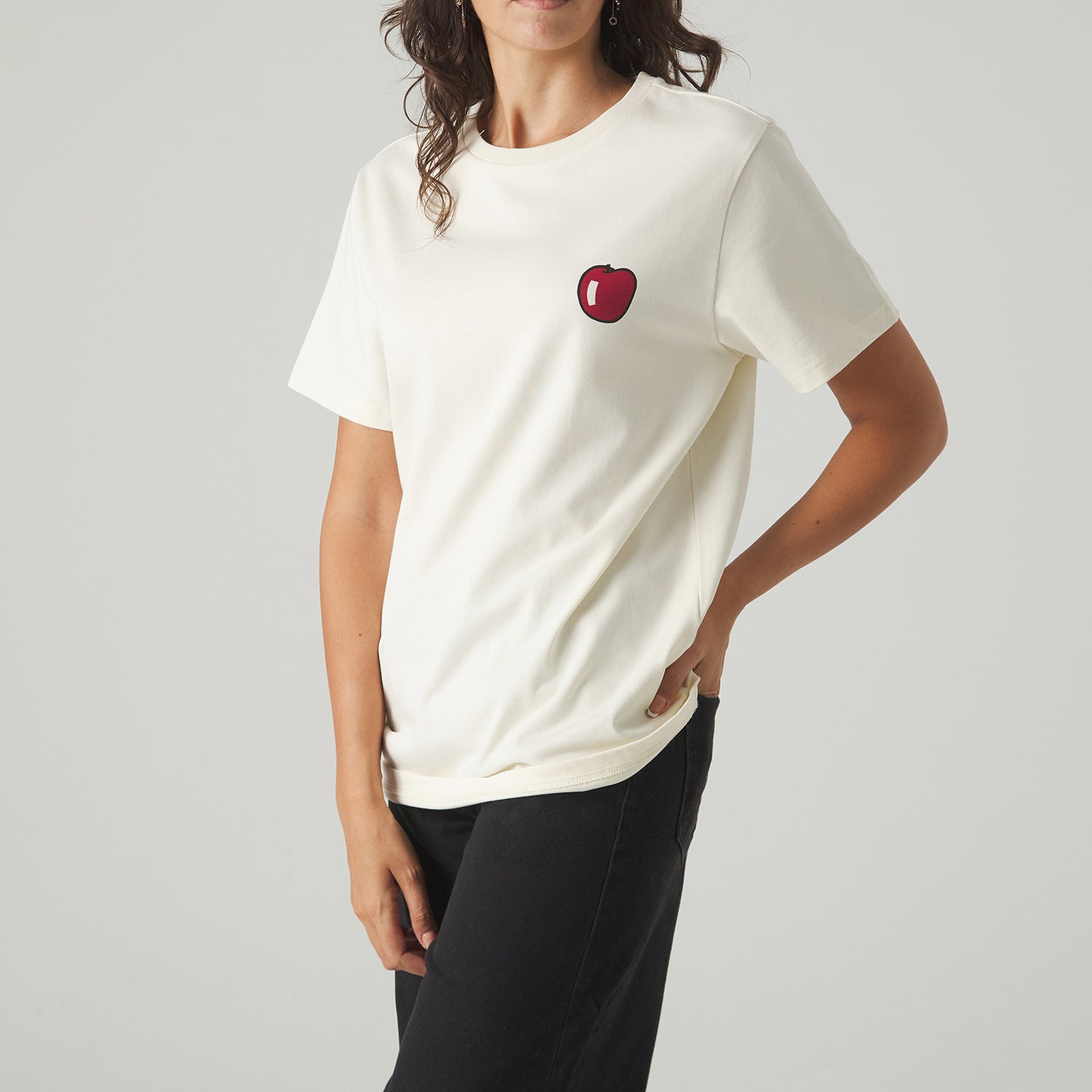 La interpretación del bodegón de Roy Lichtenstein™ cobra vida en la camiseta Roy Lichtenstein Two Apples Still Life with Crystal Bowl Tee. Los puntos Ben-Day, las superficies lisas y los intensos contrastes de color transforman un bodegón clásico en una composición moderna y vibrante. Confeccionada en algodón orgánico de 200 g y con serigrafía de alta calidad, esta camiseta mantiene intacta la fuerza gráfica original en una silueta limpia y versátil.